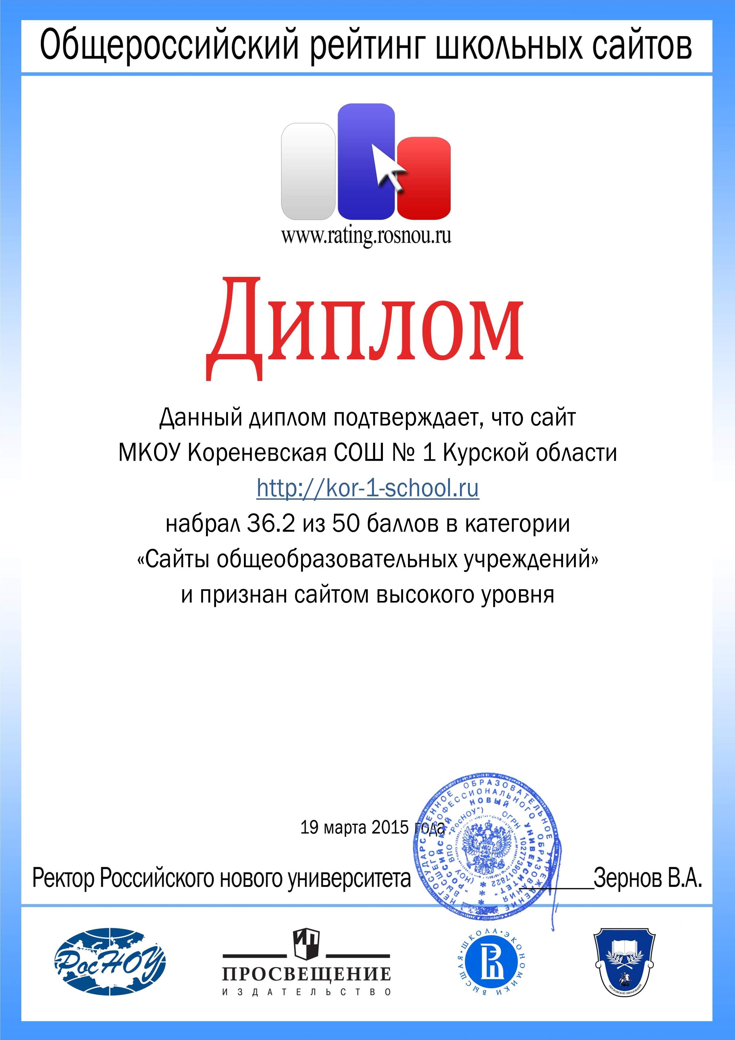 По результатам Общероссийского рейтинга сайтов общеобразовательных учреждений официальный сайт МКОУ «Кореневская СОШ №1» признан сайтом с высоким уровнем информационной насыщенности. В рейтинге приняли участие 3098 сайтов школ России из них 22 сайта школ Курской области.