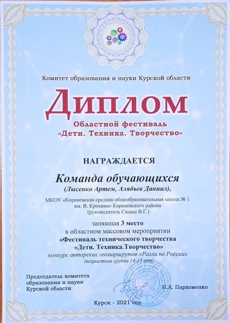 | Наши ребята Лысенко Артем и Алябьев Даниил приняли участие в областном массовом мероприятие Фестиваль технического творчества «Дети. Техника. Творчество». В конкурсе геомаршрутов «Ралли по России» они заняли почетное III место со своей работой «Интерактивная карта достопримечательностей Кореневского района».