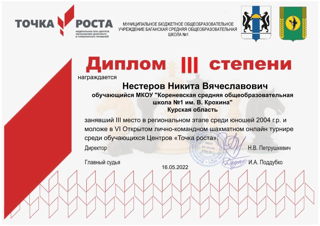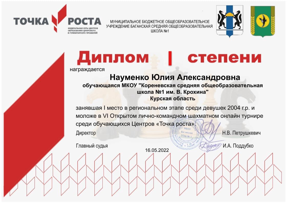 | Долгожданное лето наступило!!! Хорошее настроение и жаркая солнечная погода стали спутниками учащихся нашей школы в дни летних каникул!!! Но не только этим запомнились июньские дни ребятам, которые посещают кружок шахмат в центре образования цифрового и гуманитарного профилей «Точка роста» под чутким руководством Гончарова О. Н.16 июня состоялся областной этап II-ого лично-командного открытого шахматного онлайн-турнира по блицу среди обучающихся центров «Тоска роста». Участие в данном этапе приняли 9 центров «Точка роста» нашего региона. Результатами противостояния стали 1 место у Харламова Дмитрия и Науменко Юлии в возрастной категории 2003 год и моложе, 1 место у Новикова Кирилла и 3 место у Шкандиной Софии в возрастной категории 2010 год и моложе. 17 июня состоялся финал данного турнира. Нашим ребятам предстояло сразиться на шахматной доске с представителями Новосибирской, Томской и Ростовской областей. Воспитанники Олега Николаевича показали достойную игру и целеустремленность к победе. Систематические занятия и кропотливый помогли Харламову Дмитрию стать победителем в своей возрастной группе. Поздравляем Дмитрия с первым местом на всероссийском этапе!!!!